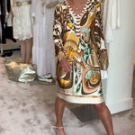 ✓ Eclectic Sunburst Print: Featuring rich browns, ochre, teal, and ivory in a mesmerizing burst of abstract paisley and geometric elements.