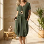 Add a touch of flair to your wardrobe with our Ubud Dress. This knee-length dress effortlessly combines style and comfort with its round neckline, classic sleeves, and convenient pockets. Made from high-quality cotton, the A-line design suits every figure and offers optimal freedom of movement thanks to its high stretch. Order your new favorite dress today!