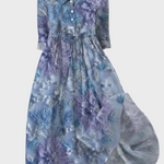 Questo lungo abito nelle tonalità di lilla e blu combina romanticismo ed eleganza. Il suo particolare motivo floreale con fiori aggiunge una sensazione di freschezza, mentre la vestibilità leggera lo rende ideale per apparizioni primaverili ed estive.
