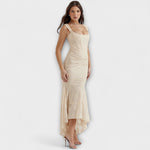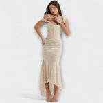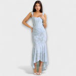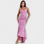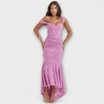 Questo splendido abito lungo in un delicato colore lilla combina eleganza e femminilità, con dettagli romantici e una vestibilità che abbraccia il corpo. Il corsetto con design drappeggiato esalta la vita, mentre la gonna asimmetrica aggiunge movimento e grazia a ogni passo.