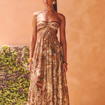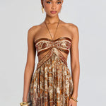 Impressionante abito maxi con ricco motivo paisley in tonalità di oro, marrone e terracotta. Il corpetto strapless con taglio audace e aperture eleganti esalta la femminilità, mentre la gonna leggera conferisce movimento ed eleganza. Ideale per serate, feste di cocktail e occasioni estive che richiedono un look glam.