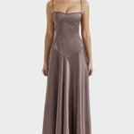 Un elegante e minimalista abito in satin che emana un'eleganza senza tempo. Con spalline sottili e cuciture discrete che accentuano la vita, crea una silhouette femminile e raffinata. Ideale per serate, matrimoni e occasioni speciali.
