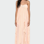 Abito maxy elegante con movimento fluido e linea femminile che abbraccia delicatamente la silhouette. Il décolleté raffinato e le sottili spalline mettono in risalto il collo e le spalle, mentre la vestibilità in vita offre una forma elegante. Ideale per matrimoni, battesimi e ogni occasione speciale.