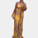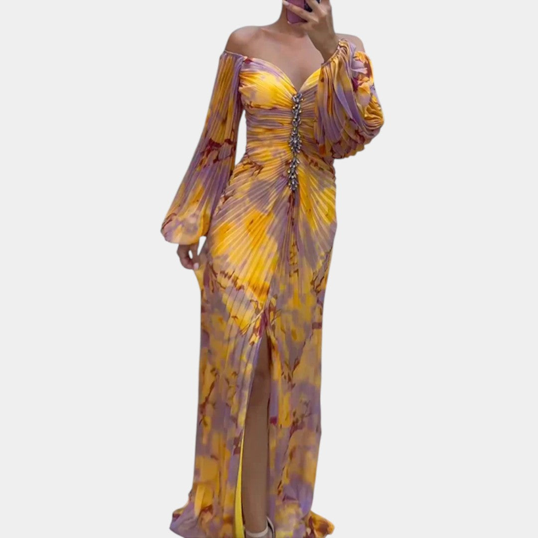 L’abito Alessia è pura eleganza e femminilità. Realizzato in tessuto plissé dai toni vivaci del giallo e del lilla, valorizza la silhouette grazie allo scollo a V profondo e alla chiusura con dettagli gioiello al centro. Le maniche lunghe a sbuffo e lo spacco frontale aggiungono un tocco sofisticato e seducente, perfetto per serate speciali ed eventi di classe.