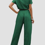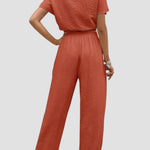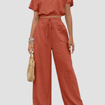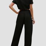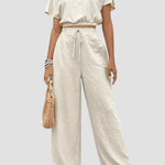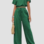 Andreina è il set che scegli per i momenti in cui vuoi combinare stile e comfort senza sforzo. Con il suo crop top a pipistrello e i pantaloni con coulisse che valorizzano la silhouette, crea un look moderno e sicuro di sé — perfetto per giornate rilassate, uscite casual e serate eleganti.