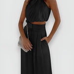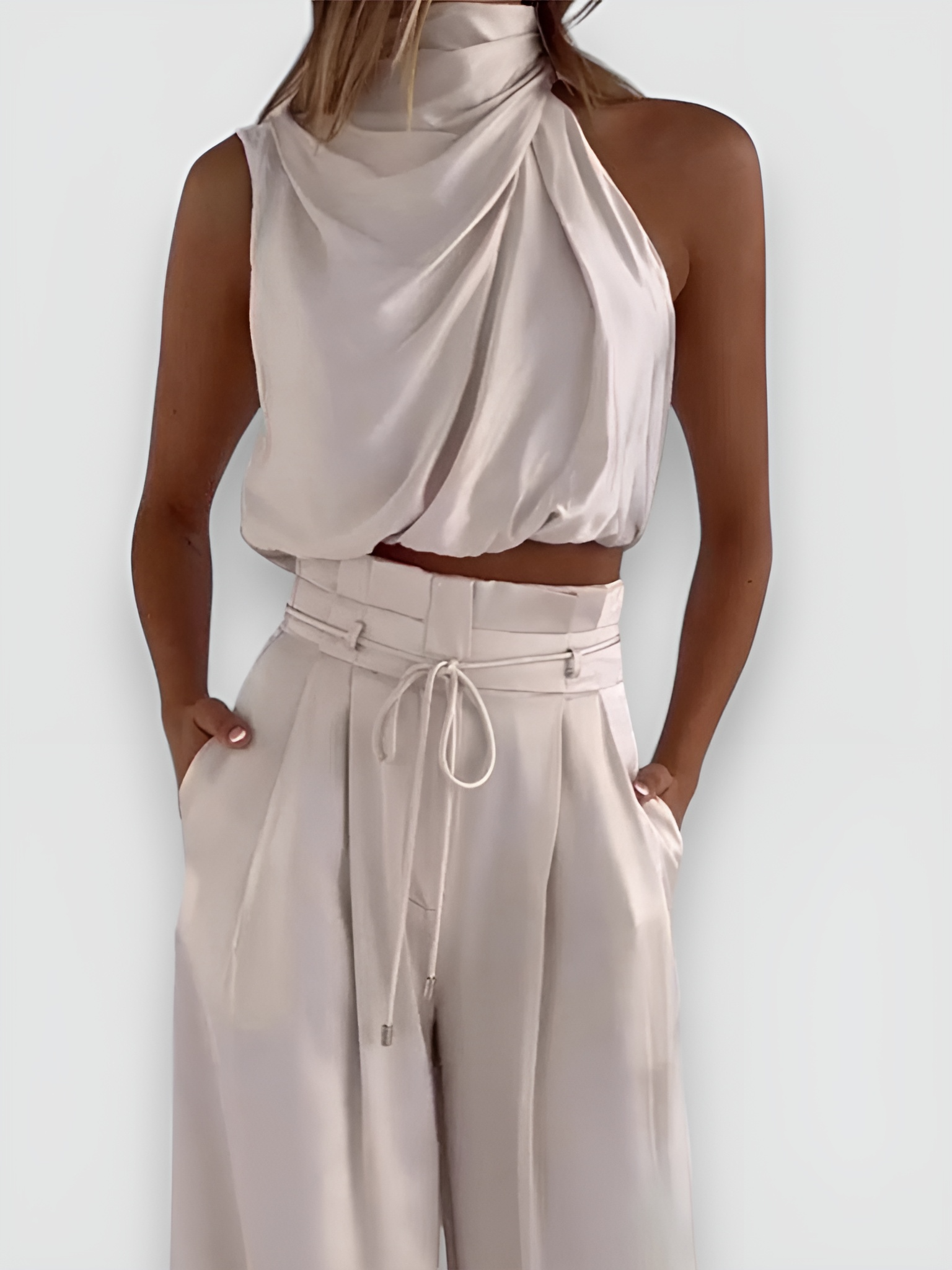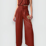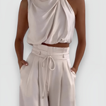 Questo elegante set è composto da un top senza maniche e pantaloni a gamba larga, perfetto per un look estivo sofisticato.