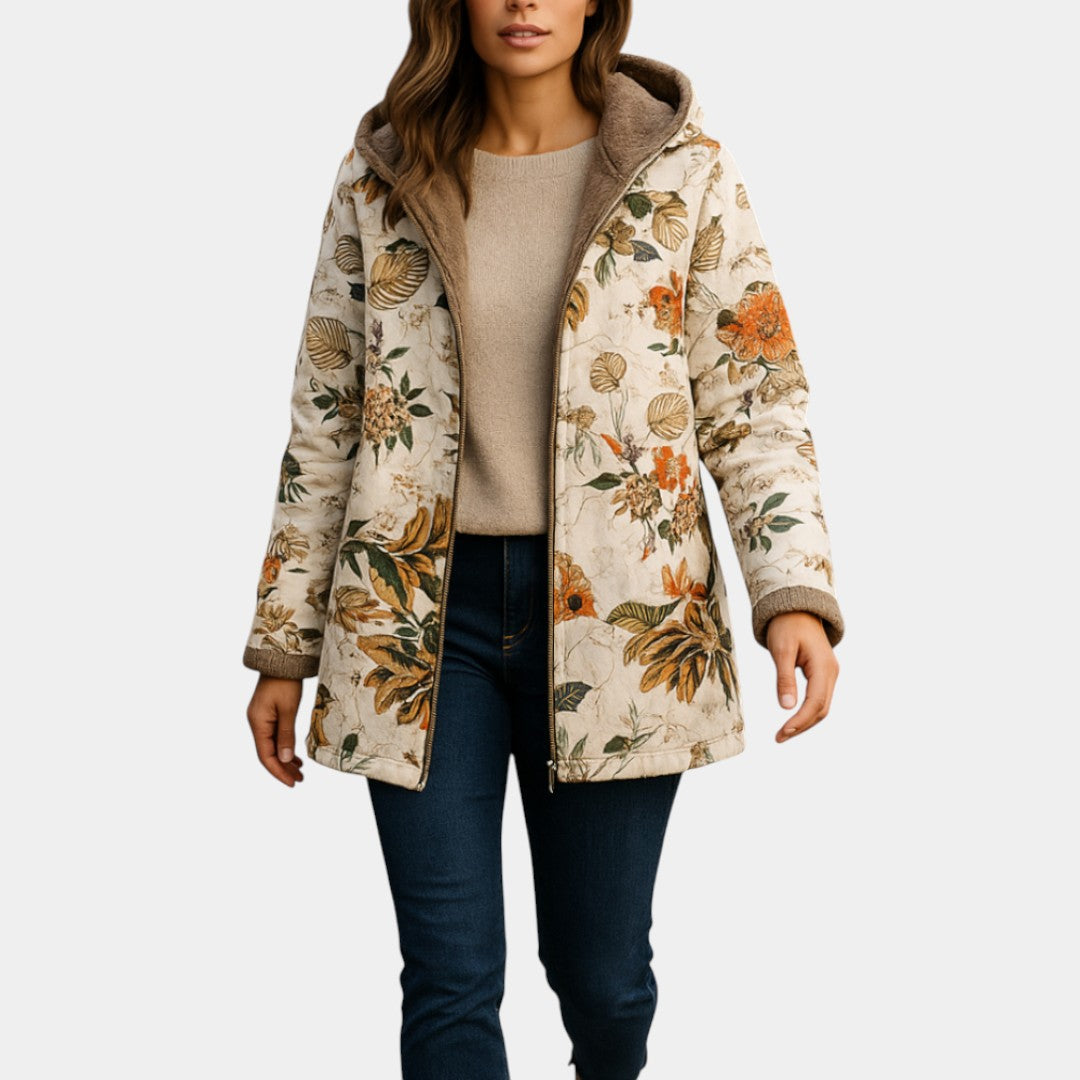 La giacca Angela unisce calore e stile in un capo invernale unico. Realizzata con esterno a fantasia floreale e interno in morbido fleece, regala comfort e protezione nelle giornate fredde. Il taglio moderno con cappuccio e chiusura a zip rende questa giacca pratica e raffinata, perfetta per chi vuole distinguersi senza rinunciare alla comodità.