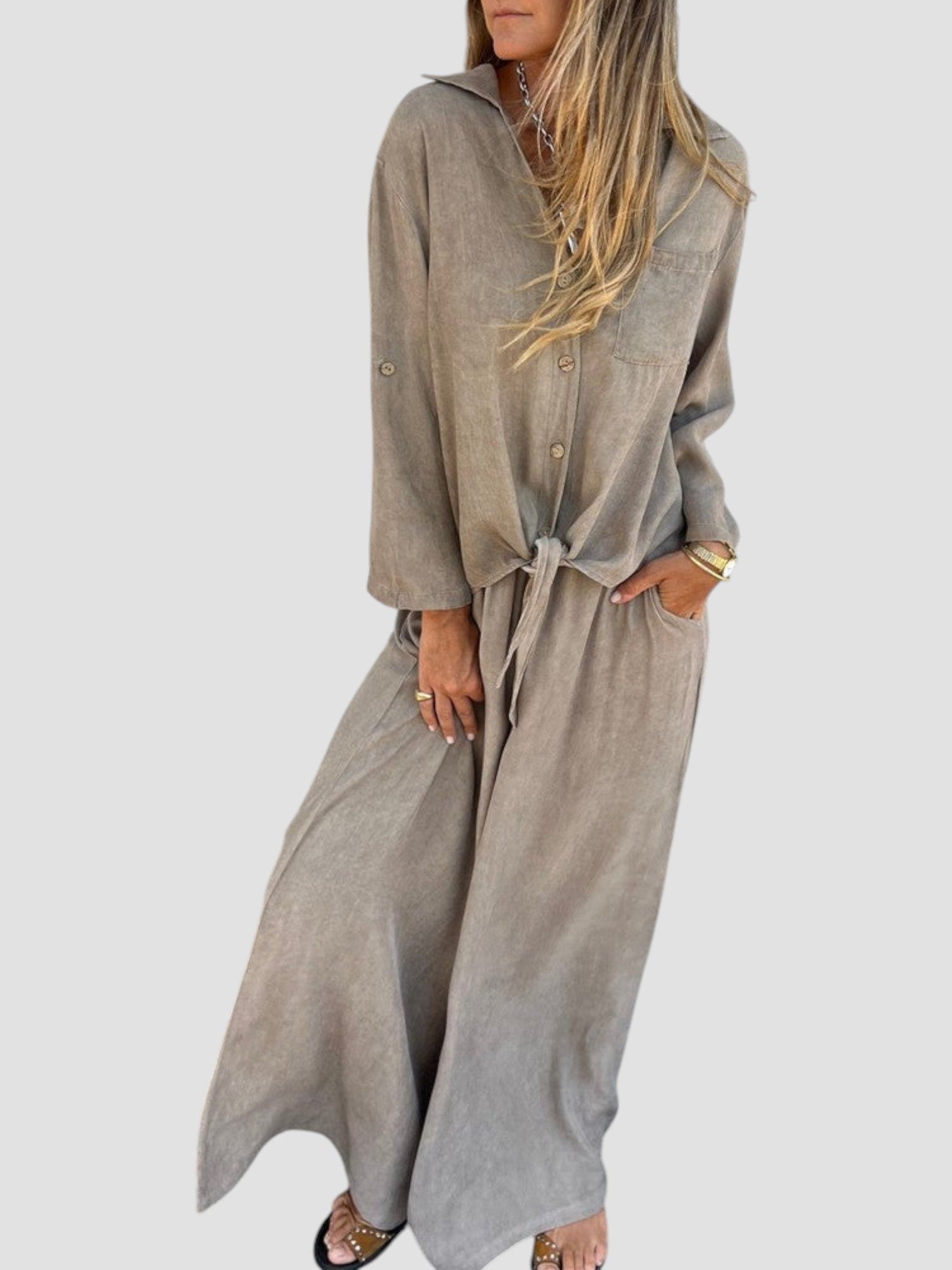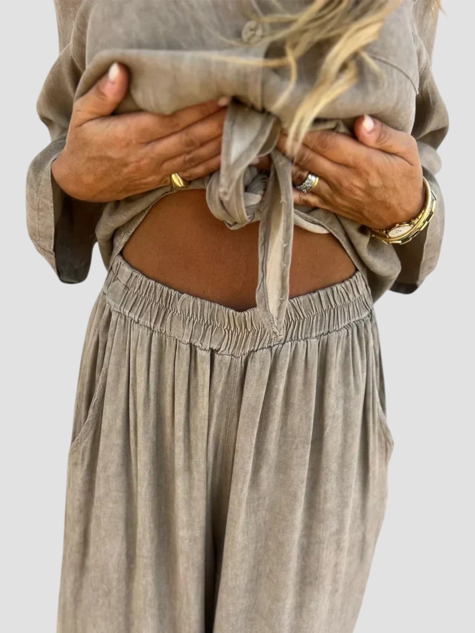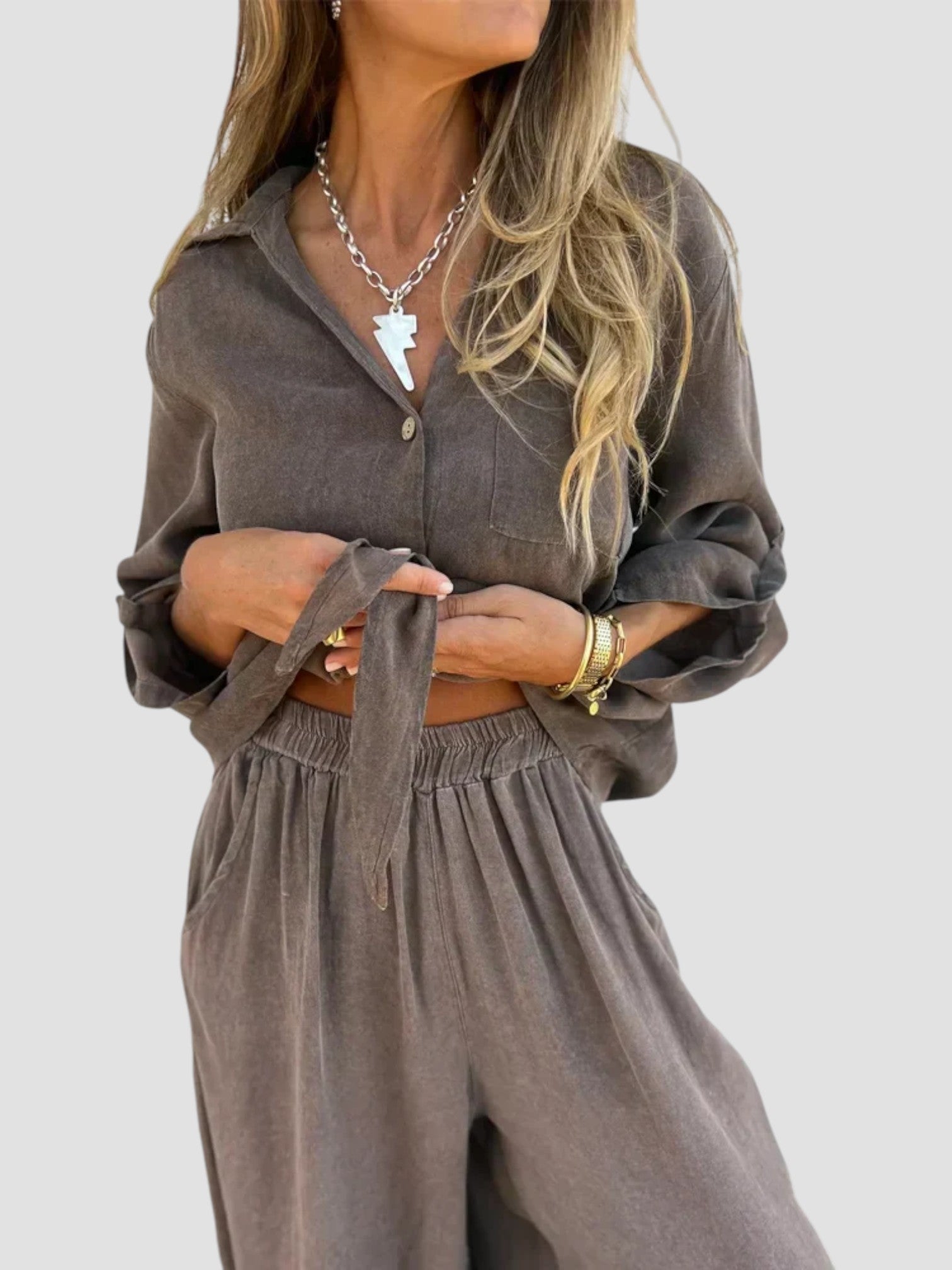 Angelica è il completo due pezzi che non può mancare nel tuo guardaroba estivo. Leggero, armonioso e incredibilmente versatile — perfetto per giornate di sole, uscite nel weekend o momenti casual chic in città.