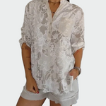 Camicia **blu da donna con motivo floreale** che offre eleganza e comfort in ogni outfit casual. Il tessuto leggero e la linea morbida la rendono ideale per le giornate calde, mentre la tasca sul petto aggiunge un tocco di stile discreto. Può essere abbinata a pantaloni corti, jeans o pantaloni bianchi per un look estivo completo.