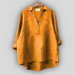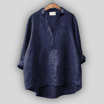 Elegante blusa di lino pura che emana freschezza e uno stile senza tempo. Presenta una scollatura a V con una patta discreta, maniche lunghe che possono essere arrotolate e una finitura asimmetrica con un retro più lungo, offrendo comfort e libertà di movimento. Una scelta ideale per look estivi freschi o un look casual elegante.