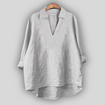 Blusa di lino elegante che emana un'eleganza minimalista e uno stile senza tempo. Il profondo scollo a V con un elegante colletto conferisce una linea moderna, mentre la vestibilità ampia offre comfort e libertà di movimento. La finitura asimmetrica con un retro più lungo completa l'estetica elegante.