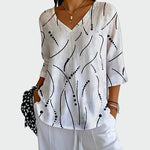 La blusa bianca con righe nere e motivi a pois è una combinazione perfetta di semplicità ed eleganza. Il collo a V aggiunge femminilità, mentre il tessuto morbido la rende ideale per l'uso quotidiano ma anche per look più chic.