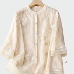 La blusa avorio con delicati ricami floreali è un pezzo elegante e leggero che trasmette femminilità e semplicità. Con bottoni sulla parte anteriore e maniche 3/4, offre comfort e stile per ogni occasione.