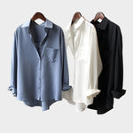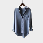 Camicia elegante in tonalità grigia con colletto bianco. La linea morbida e l'orlo leggermente asimmetrico offrono comfort e un'estetica moderna per ogni giorno.