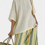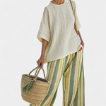Naturale, fresco e con una sensazione marina. Il completo Daisy in tonalità oliva e giallo chiaro combina una blusa ampia in lino di bambù con pantaloni a righe verticali, offrendo un'estetica rilassata con un tocco elegante e luminoso.