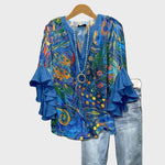 Metti in risalto il tuo stile artistico con questa blusa in una vivace tonalità di blu, decorata con motivi astratti colorati e dettagli che ricordano una tela pittorica. Le maniche a volant aggiungono eleganza e movimento, mentre la linea comoda la rende ideale per look quotidiani e speciali.