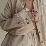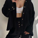 Effortless Style: Button-up top and drawstring shorts create a cohesive, chic look.