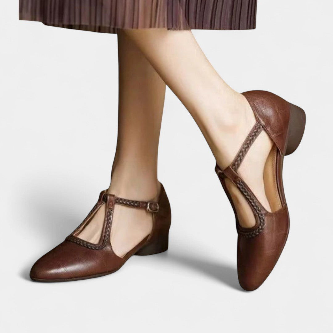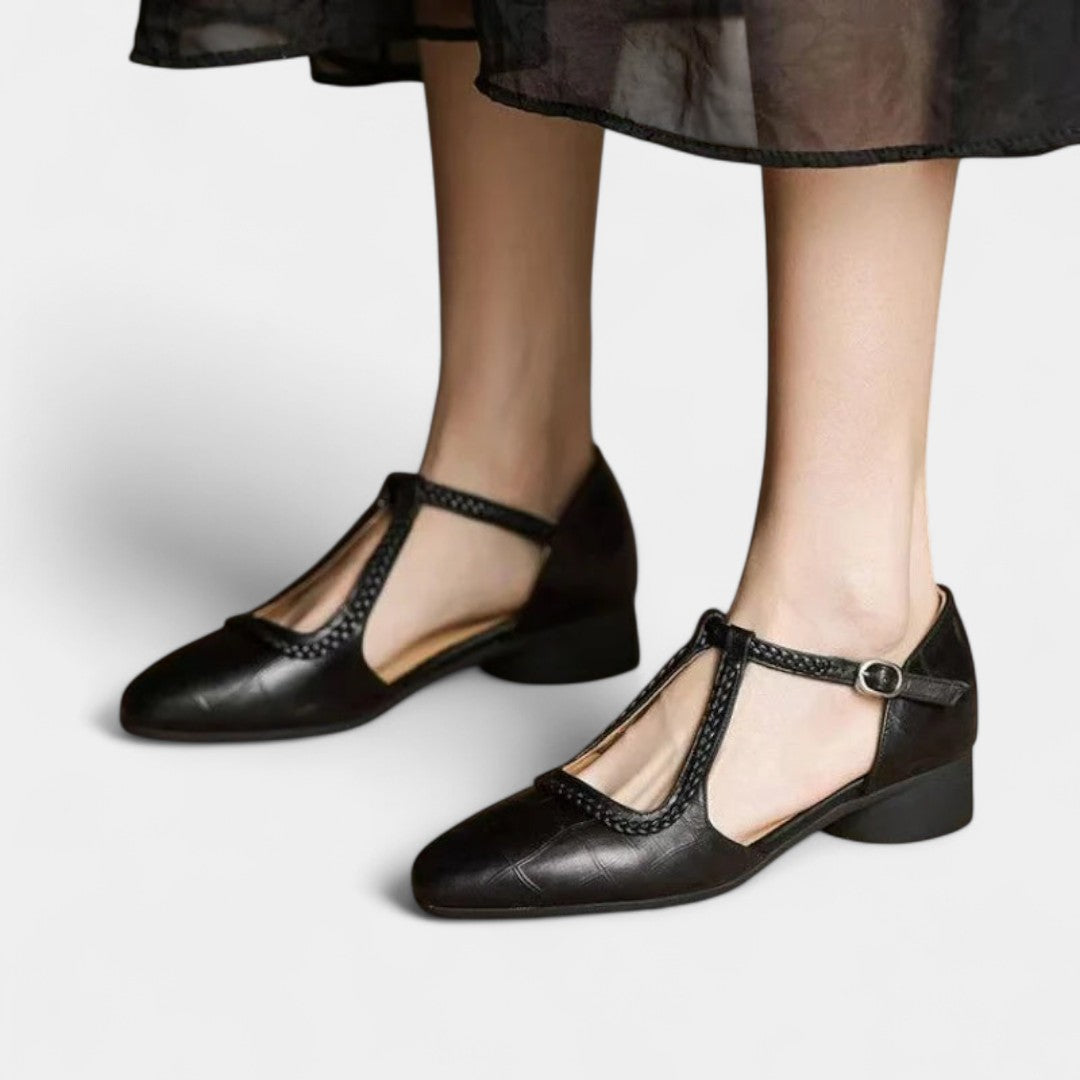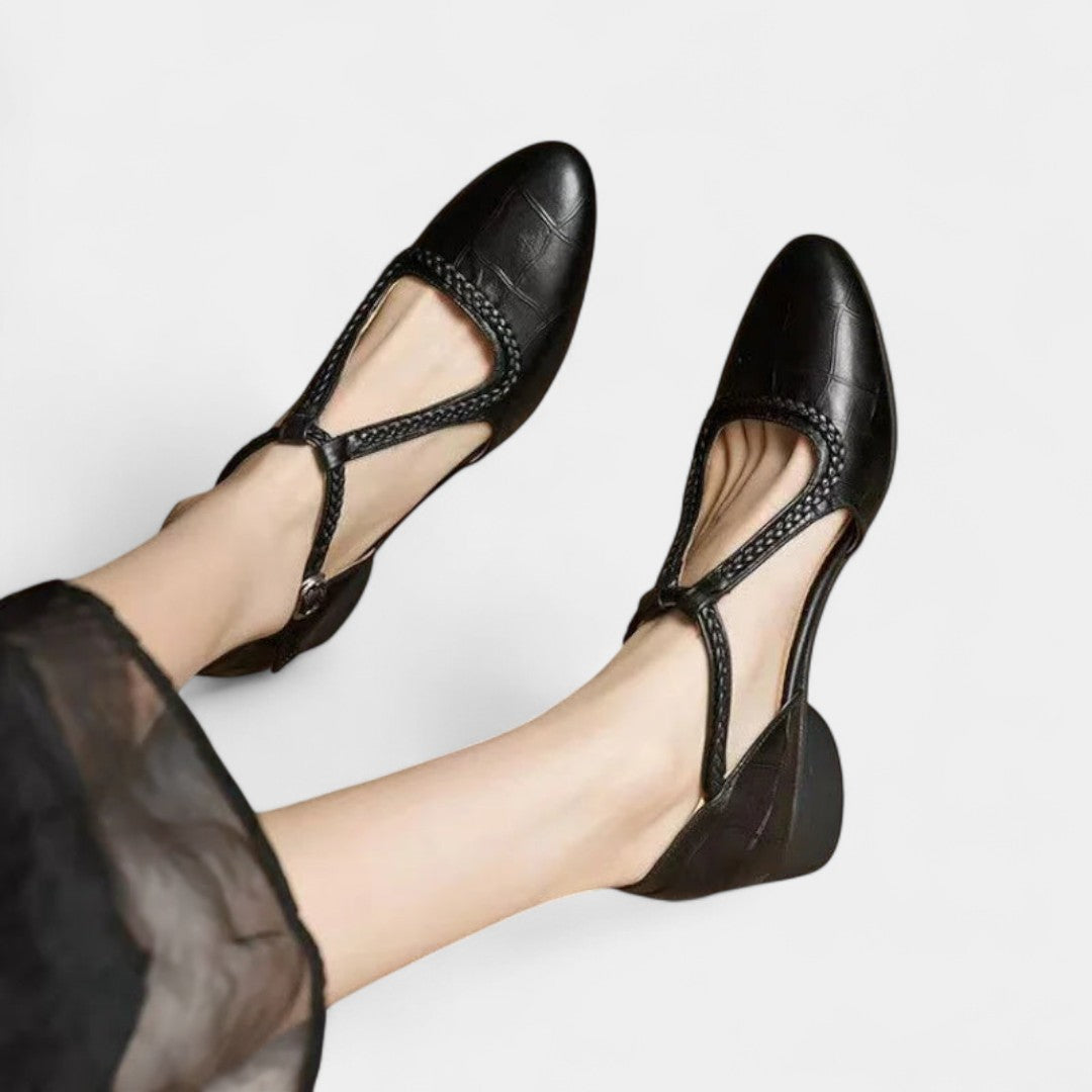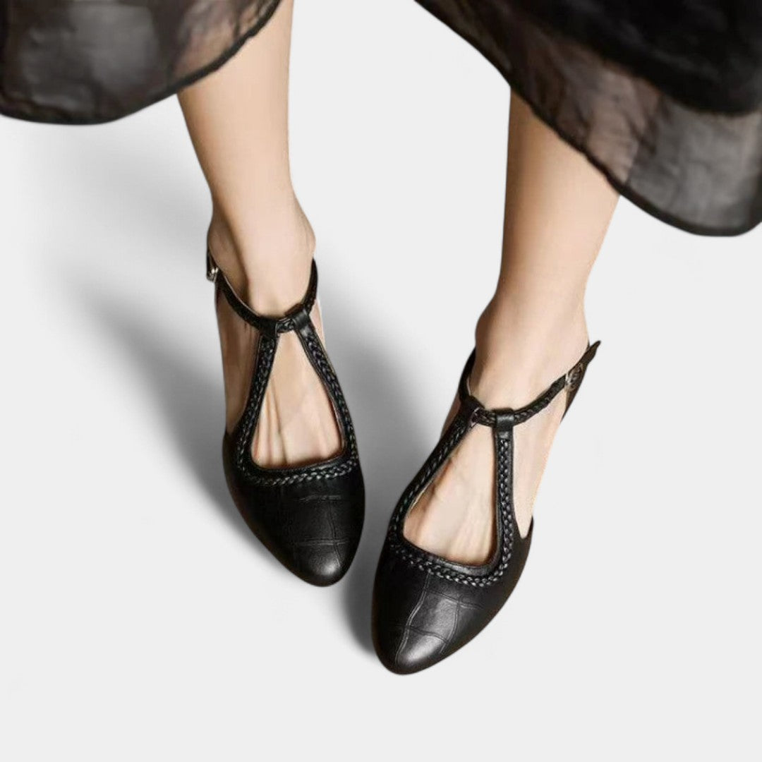 EVe unisce il classico design a T con sottili dettagli intrecciati che donano un tocco unico. Il tacco basso garantisce comfort per tutto il giorno, mentre la forma elegante rende la scarpa ideale sia per l’uso quotidiano che per occasioni speciali.