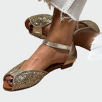 Questi sandali scintillanti in tonalità dorata con glitter sono ideali per chi ama distinguersi con stile. Il loro design unico con punta aperta e cinturino alla caviglia offre comfort e stabilità, mentre la loro luminosità li rende la scelta perfetta per serate o occasioni speciali.