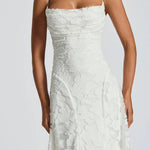 Un abito mozzafiato e romantico che emana lusso ed eleganza. Le sottili spalline e il décolleté conferiscono un fascino femminile, mentre il ricco tessuto con motivi in rilievo aggiunge una texture e un movimento unici. Ideale per matrimoni, eventi formali o eleganti apparizioni serali.
