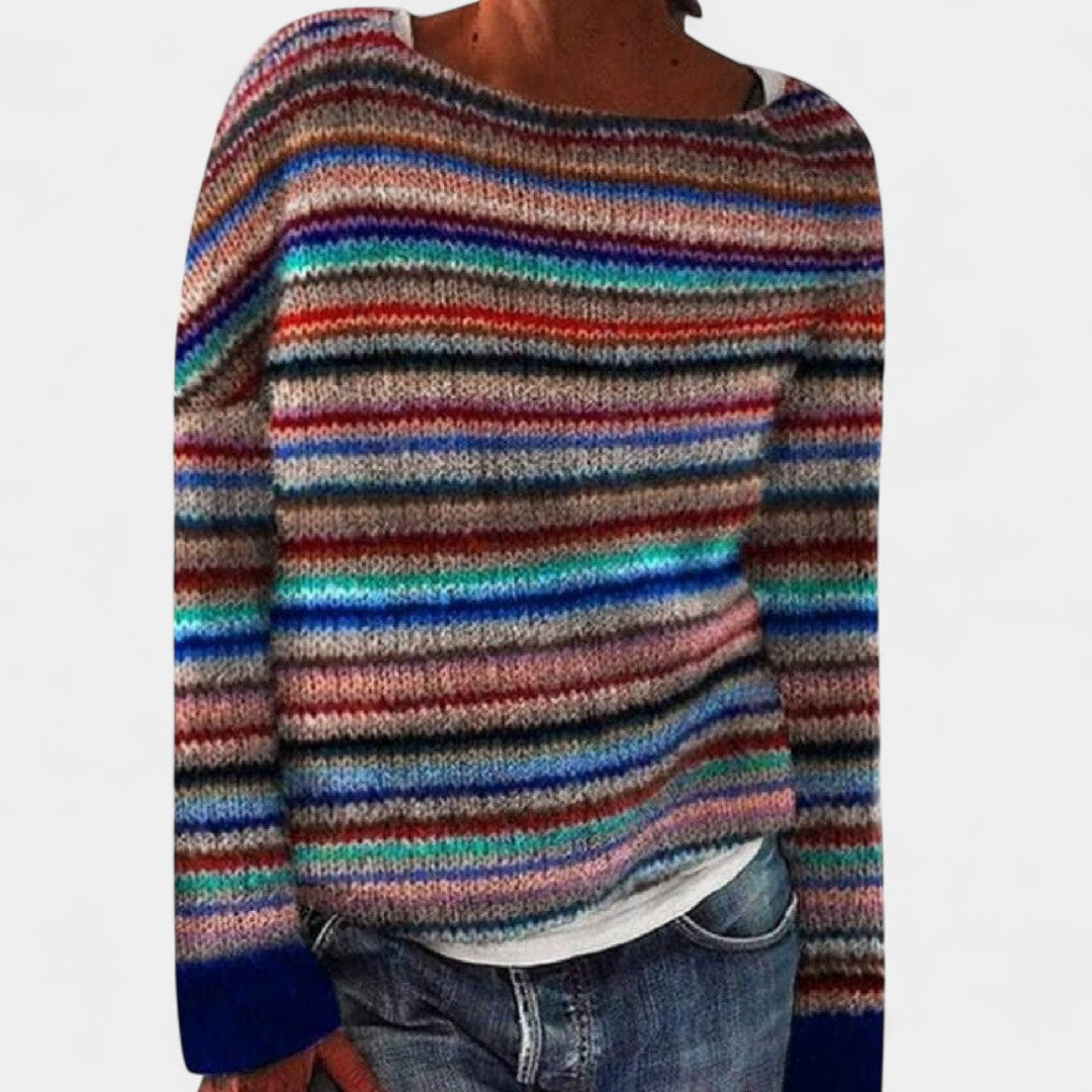 Un maglione che unisce comfort e stile vintage. Il pullover Graziana è caratterizzato da un mix di colori vivaci e da un design a righe che richiama un’eleganza dal fascino retrò.