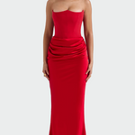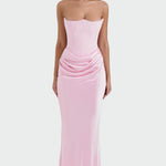 Un abito impressionante e sensuale con corpetto senza spalline e linea aderente che esalta la silhouette. Il dettaglio delle eleganti pieghe in vita dona femminilità e un'unica fluidità, mentre la lunghezza maxi conferisce un'eleganza senza tempo. Ideale per serate formali e apparizioni brillanti.