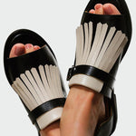 Questi sandali unici con design particolare si distinguono per il loro carattere innovativo e la comoda vestibilità. La combinazione di nero e bianco con eleganti fasce crea un aspetto impressionante che emana stile e personalità.