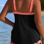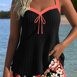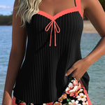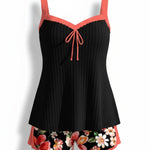 Two-Piece Tankini Set: Includes a flared, ribbed black top with scalloped coral accents and high-rise floral shorts for stylish support.