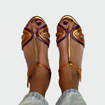 Metti in risalto il tuo stile unico con questi straordinari sandali in tonalità dorate, arancioni e viola. Il loro design elegante con cinghietto alla caviglia offre stabilità e comfort, mentre i vivaci dettagli metallici li rendono un'ottima scelta per uscite serali o look estivi.