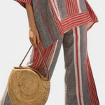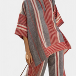 Stile mediterraneo con un'atmosfera rilassata. La salopette Daisy combina righe rosse corallo con toni di grigio pietra in una silhouette ampia e fluida che ricorda l'estate e l'autenticità.