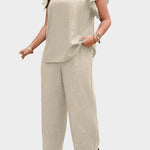 Il set lilla con pantaloni larghi e blusa con volant sulle maniche combina stile e comfort, ideale per ogni occasione – da una passeggiata pomeridiana a un'uscita speciale.