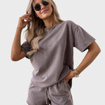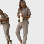 Questo comodo set di due pezzi in una morbida tonalità grigia combina stile e praticità, ideale per look quotidiani. Il design minimalista offre eleganza senza sacrificare il comfort.