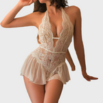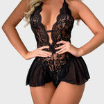 Questo sensuale body in pizzo nero combina pizzo e trasparenze per un risultato assolutamente femminile e seducente. Il design con audaci aperture e dettagli floreali esalta la silhouette, mentre il corto volant alla base aggiunge un'eleganza giocosa.