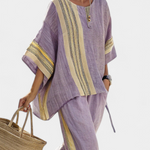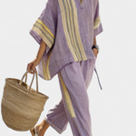 Eleganza rilassata con un tocco artistico. Il set Daisy in morbida lavanda con dettagli senape combina freschezza naturale con design boho, ideale per passeggiate in riva al mare o uscite estive pomeridiane con uno stile comodo.