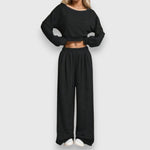 Set moderno a 2 pezzi con felpa senza maniche e pantaloni larghi con cordino. Ideale per un look casual e sportivo.