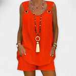 L'outfit estivo chic assoluto che combina freschezza ed eleganza. La canotta senza maniche con scollatura a V mette in risalto il décolleté in modo discreto, mentre i pantaloni corti offrono una vestibilità comoda e una linea femminile. Un set moderno per ogni momento della giornata.