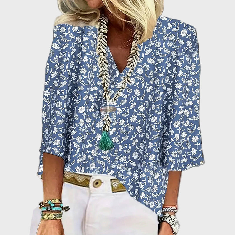 Rinnova il tuo abbigliamento quotidiano con questa blusa in tonalità blu, decorata con piccoli motivi floreali bianchi. Il suo design classico con maniche a tre quarti offre comfort ed eleganza, mentre la linea morbida la rende un'opzione ideale per ogni momento della giornata.