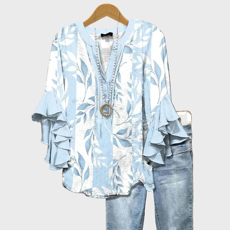 Rinnova il tuo stile estivo con questa blusa in tonalità azzurra, decorata con eleganti motivi fogliari bianchi. I dettagli romantici delle maniche a volant aggiungono movimento e femminilità, mentre la vestibilità comoda offre facilità ed eleganza per ogni momento della giornata.