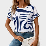 Una maglietta elegante con un moderno design astratto in tonalità blu e bianche. Il pezzo ideale per apparizioni quotidiane che si fanno notare.