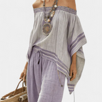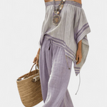 Top in bambù a righe, con spalle scoperte e pantaloni larghi per uno stile elegante e fresco