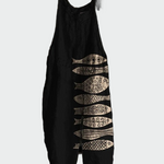 L'Ispirazione Artistica è una tuta intera che si distingue per il suo design particolare con i pesci decorativi. La sua vestibilità comoda offre comfort, mentre lo sfondo nero con i motivi beige crea un aspetto unico e artistico.