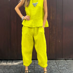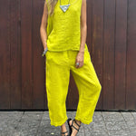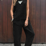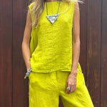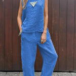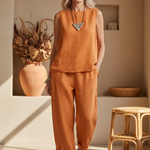 ✔ Effortless Style: A chic pairing of sleeveless top and ankle-length trousers for a cohesive look.
